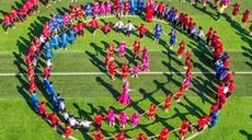 12月8日,在广西忻城县城关镇民族小学,身穿民族服饰校服的学生在来自广东的支教老师组织下进行课间活动(无人机照片)。